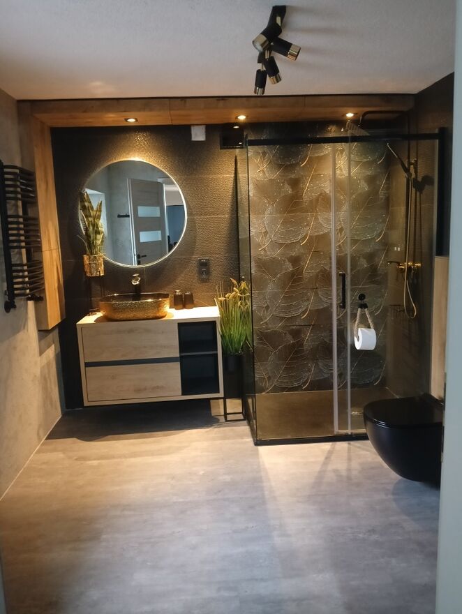 Na piętrze mamy identyczny układ, przy czym w łazience dostępną mamy wannę oraz dwa duże tarasy.