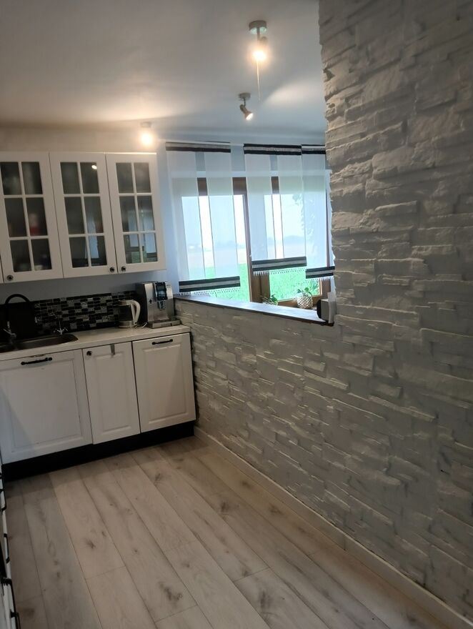 przestronny salon z otwartą kuchnią, przedpokój, łazienka z prysznicem, dwie duże sypialnie .